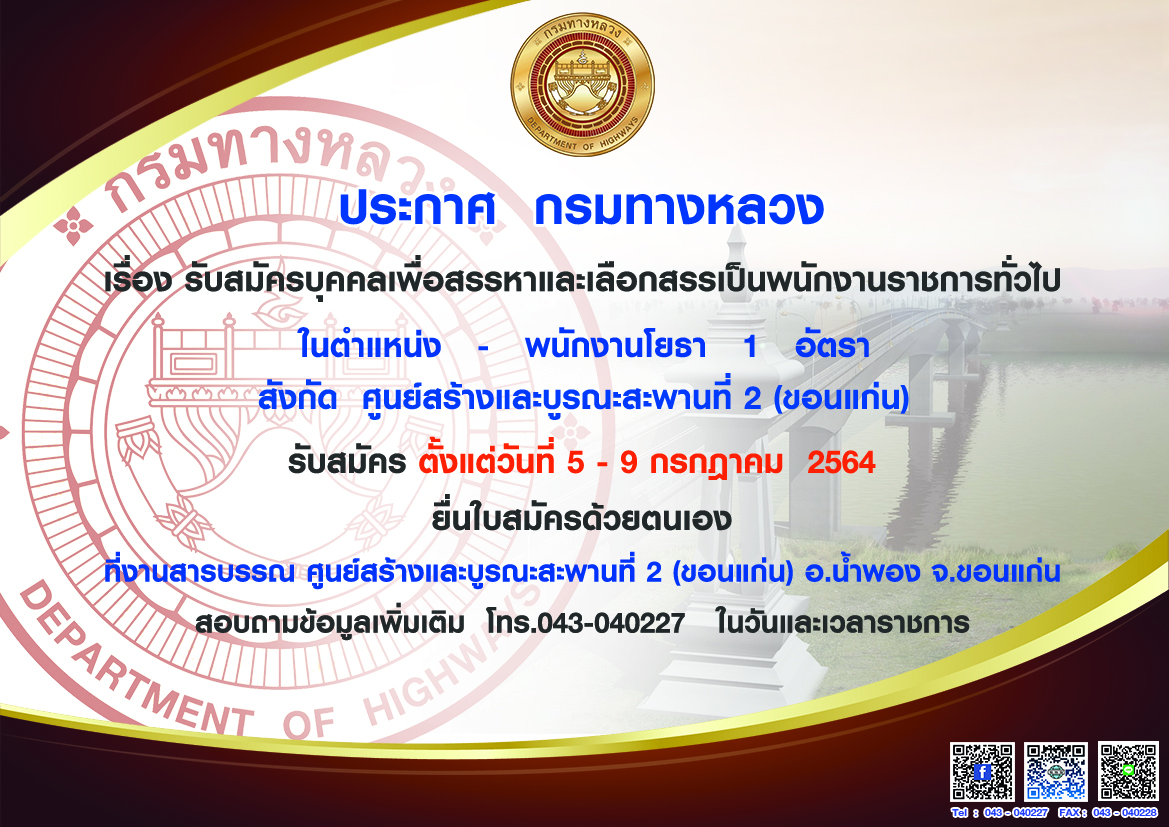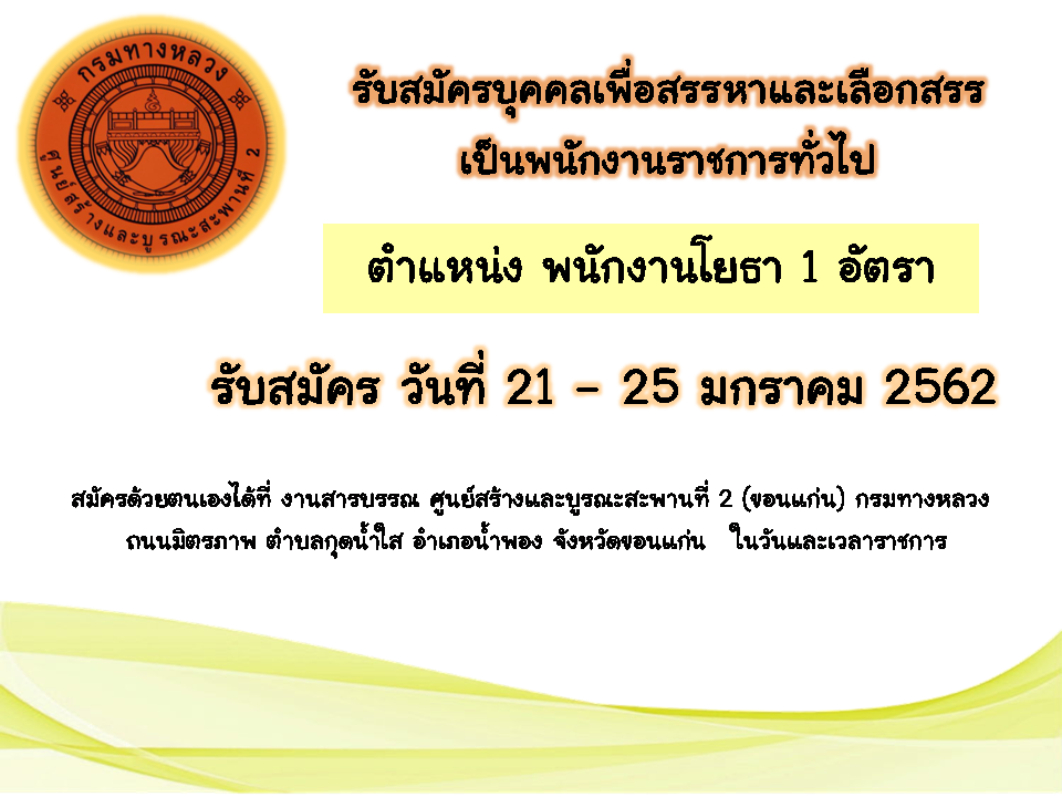 รับสมัครบุคคลเพื่อสรรหาและเลือกสรรเป็นพนักงานราชการทั่วไป ตำแหน่ง พนักงานโยธา 1 อัตรา