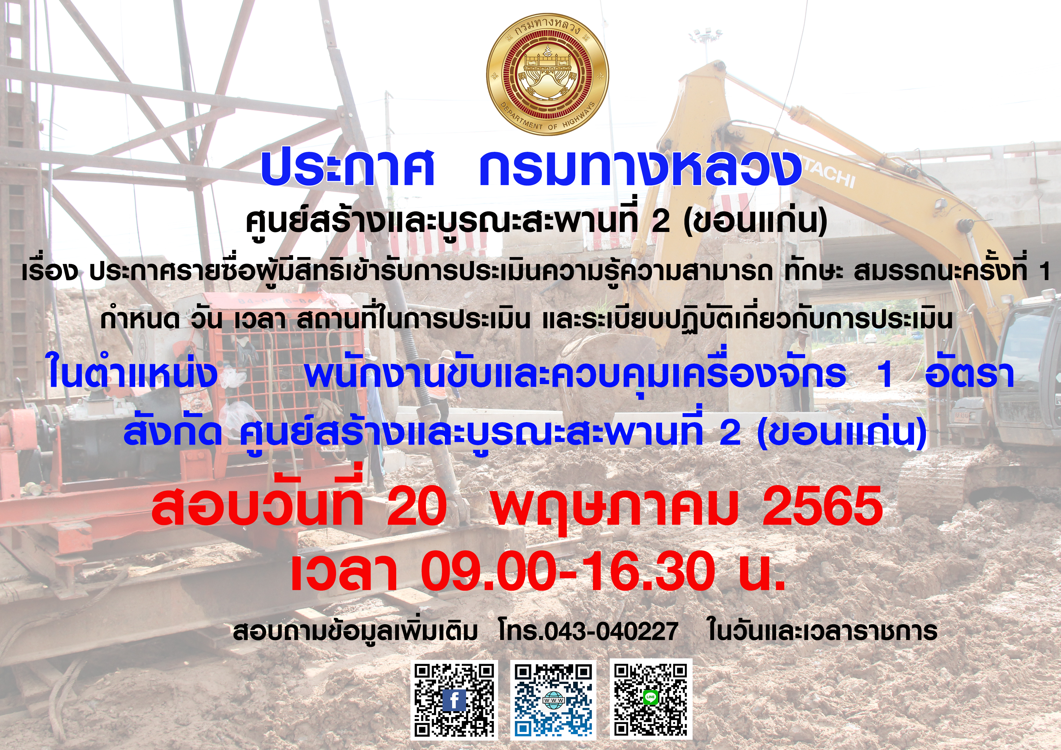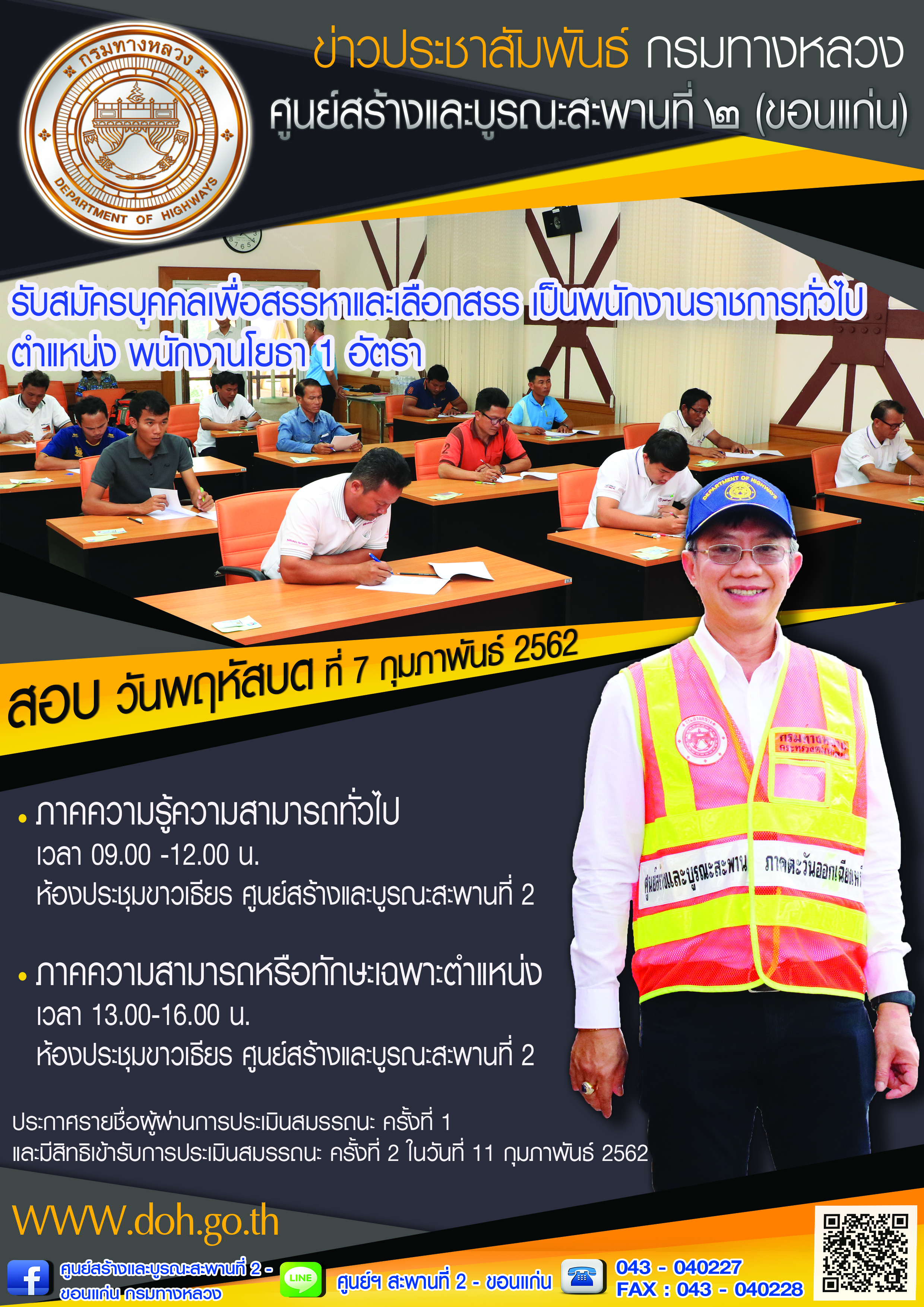 รายชื่อผู้มีสิทธิเข้ารับการประเมินความรู้ความสามารถ ทักษะ สมรรถนะ ครั้งที่ 1 กำหนด วัน เวลา สถานที่ในการประเมิน และระเบียบปฏิบัติเกี่ยวกับการประเมิน ตำแหน่ง พนักงานโยธา