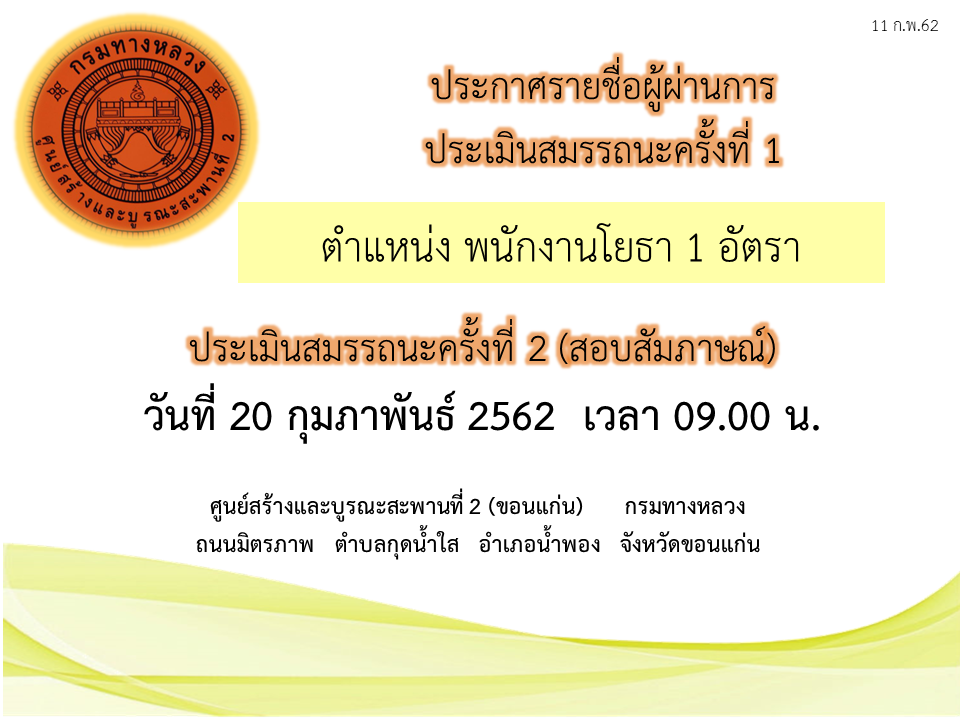 ประกาศรายชื่อผู้ผ่านการประเมินสมรรถนะครั้งที่ 1 และมีสิทธิ์เข้ารับการประเมินสมรรถนะครั้งที่ 2 ตำแหน่ง พนักงานโยธา 1 อัตรา