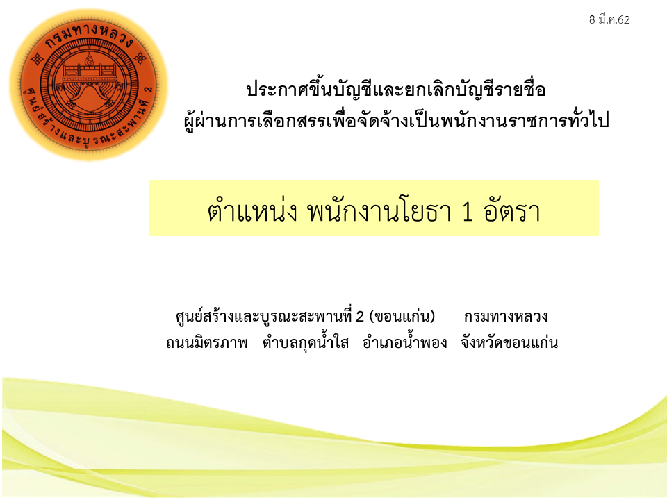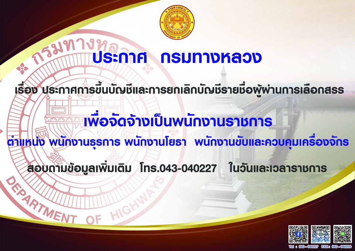 ประกาศขึ้นบัญชีและยกเลิกบัญชีรายชื่อผู้ผ่านการเลือกสรรเพื่อจัดจ้างเป็นพนักงานราชการทั่วไป ตำแหน่งพนักงานโยธา