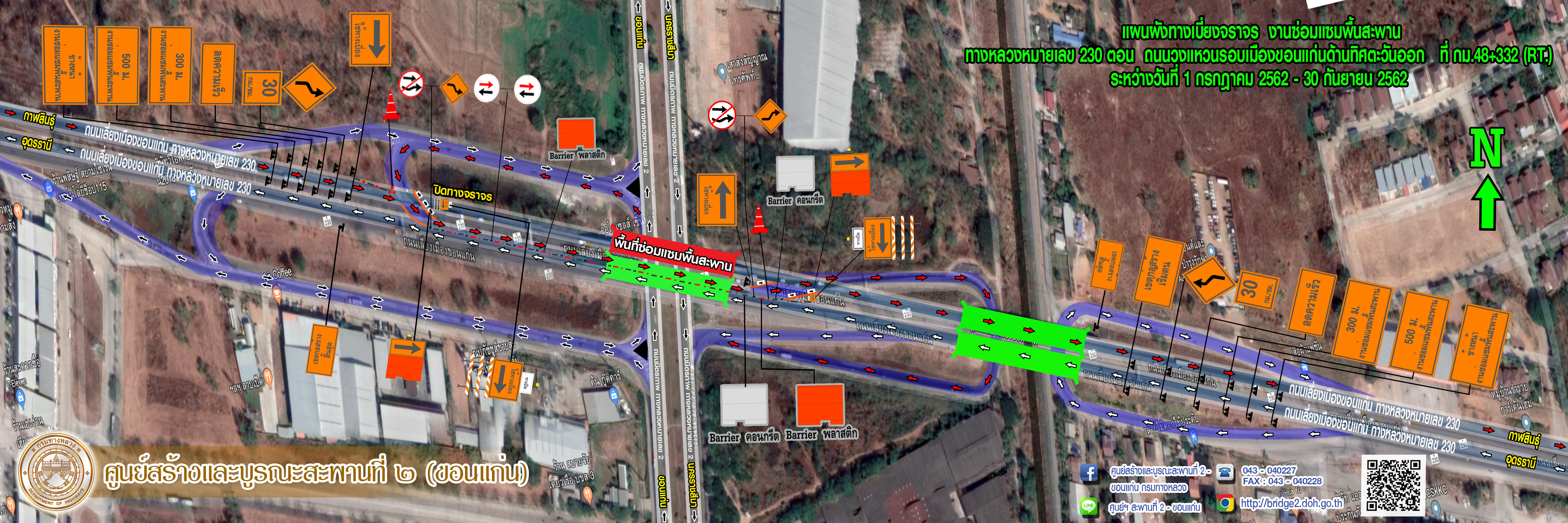 ประชาสัมพันธ์ แจ้งเบี่ยงจราจร งานซ่อมแซมพื้นสะพานทางหลวงหมายเลข 230 ตอน ถนนวงแหวนรอบเมืองขอนแก่นด้านทิศตะวันออก ที่ กม.48+332 (RT.) ระหว่างวันที่ 1 กรกฎาคม - 30 กันยายน 2562