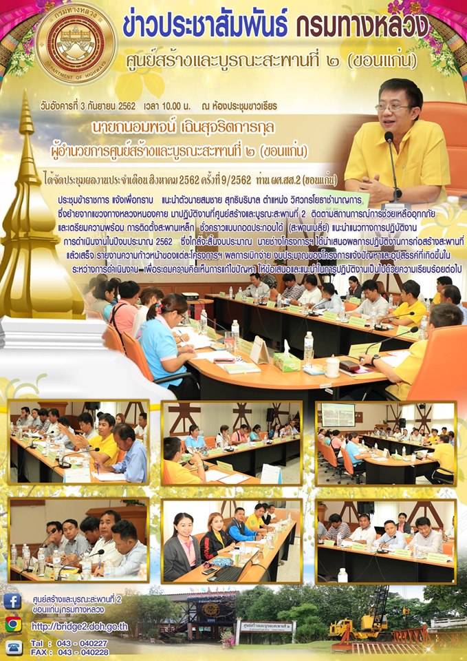 นายถนอมพจน์ เฉินสุจริตการกุล ผู้อำนวยการศูนย์สร้างและบูรณะสะพานที่ 2 (ขอนแก่น) ประชุมผลงานประจำเดือน สิงหาคม 2562 ครั้งที่ 9/2562 ณ ห้องประชุมขาวเธียร ท่าน ผศ.สส.2 (ขอนแก่น) ประชุมข้าราชการ แจ้งเพื่อทราบ แนะนำตัวนายสมชาย สุทธิบริบาล ตำแหน่ง วิศวกรโยธาชำนาญการ ซึ่งย้ายจากแขวงทางหลวงหนองคาย มาปฏิบัติงานที่ศูนย์สร้างและบูรณะสะพานที่ 2 ติดตามสถานการณ์การช่วยเหลืออุทกภัย และเตรียมความพร้อม การติดตั้งสะพานเหล็กชั่วคราวแบบถอดประกอบได้(สะพานเบลี่ย์) แนะนำแนวทางการปฏิบัติงาน การดำเนินงานในปีงบประมาณ 2562 ซึ่งใกล้จะสิ้นงบประมาณ นายช่างโครงการฯ ได้นำเสนอผลการปฏิบัติงานการก่อสร้างสะพานที่แล้วเสร็จ รายงานความก้าวหน้าของแต่ละโครงการฯ ผลการเบิกจ่ายงบประมาณของโครงการแจ้งปัญหาและอุปสรรค์ที่เกิดขึ้นในระหว่างการดำเนินงาน เพื่อระดมความคิดเห็นการแก้ไขปัญหา ให้ข้อเสนอและแนะนำในการปฏิบัติงานเป็นไปด้วยความเรียบร้อยต่อไป
